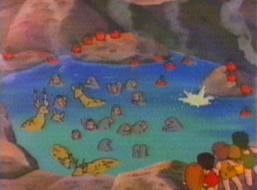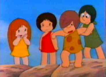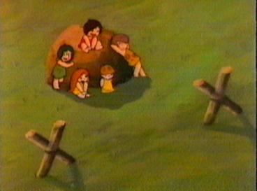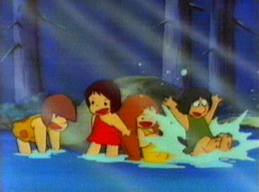 Not long after, the geyser erupts. The children run for cover and soon find them selves in hot water of another kind. The grown ups are furious that the children went up there when they had been told to stay put. Strong-arm realises that Kum Kum is the ring leader and so as a punishment he will be put into the Wood Cave. Kum Kum tries to tell them about the shadow moving and the fact that the animals are bathing. The grown ups lead by Strong-arm plug the geyser with a huge rock which holds for a few minutes but the power of the geyser destroys the rock. The children still try to explain what they have discovered. The grown ups still refuse to listen. The Wise One, however, is interested and listens to the children. Soon he realises that Kum Kum has thought of a way of measuring when the geyser will erupt - a sort of sundial. the whole village is able to make use of the hot water safe in the knowledge that the sundial will let them know when danger is approaching. The children and the villagers can then enjoy the hot water in complete safety.