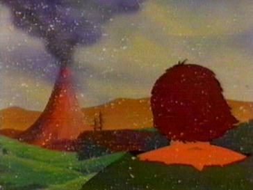 Strong arm, Flora, Water Lily and Wild Flower are out working in the fields. The food crops are not very good this season due to very poor weather. Strong arm is not sure why but they have had a very wet period recently but is concerned that their will not be enough food to go round. As they gather in the potato crops the children are busy chasing the Cheeky Squeakies. They find hundreds of the creatures all gathered together on a mushroom shaped rock. The children do not know why they are there but as they investigate everywhere goes very quiet. Suddenly the volcano erupts causing a huge explosion. The village survives but the villagers are then faced with raining ash. It lands like snow and the children play in it. The cheeky squeakies get trapped in the ash and so the children decide to rescue them.