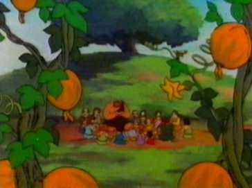 In gratitude the cheeky squeakies leave the children a shiny egg. Butterfly looks after the egg whilst Jumbo and the other boys go hunting for more eggs. Whilst away Butterfly's egg stops shining and she thinks it's dead. The boys return, however, with more shiny eggs and they too stop shining. They take all the eggs to the lake belonging to a gigantic dinosaur called Saurus. They ask the dinosaur if they me leave the eggs in the waters. The giant dinosaur refuses them entry but sprays the eggs with water. The eggs immediately start shining again and suddenly hatch open. They turn out to be large seeds and not eggs. The seeds produce large melon plants which when planted produce a huge crop of food. The Cheeky Squeakies have saved the village.