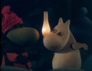 Just then, the big healthy Hemulen heard the cries of Sorry Oo. He rushed to the dog's aid and beat back the wolves with a flaming torch. Sorry Oo was shaken but safe thanks to the Hemulen. Sorry Oo realised that he had made a another mistake, the Hemulen was a real friend. The wolves left the valley. The two friends walked back to the Moominvalley house and were met by Moomintroll. Moomintroll's opinion of the Hemulen now changed as he realised what a brave creature he really was. They all now went back to the Moomin house where it was warm and safe.