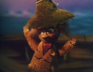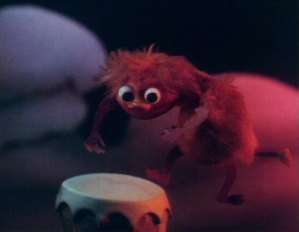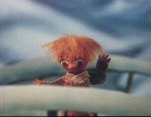 The Groke is a very frightening creature. It moves very slowly but never seems to stop in that it pursues relentlessly whatever prey it has set its mind on. He/she appears in several episodes during the Midwinter episodes. Whenever the creature is near, the air is chilled. Fires are quickly extinguished and everyone starts to feel their blood go cold. The Groke is actually seen pursuing a victim in (Moomintroll to the rescue). The victim turns out to none other that the Hemulen who once looked after Moominpappa at the orphanage.