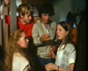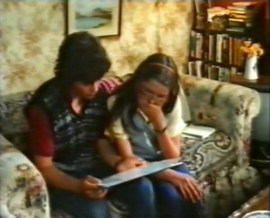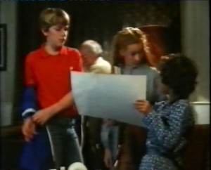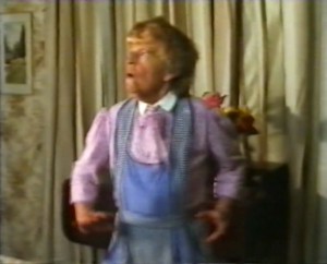At the Firkettle's house, the children decide to do a test and a bit of snooping. Essie prepares some green ribbon and Dave decides to go upstairs to the attic door to see if he can get a glimpse of Mrs. Ems daughter. Before the Essie is ready and whilst Dave is knocking on the attic door, Miss EMS returns much to the surprise of Essie who tries to stall her so Dave can make his escape. Essie tests the green ribbon garter out which Miss EMS says it is not hers. Dave still has not come down and as Miss EMS starts to climb the stairs, Essie asks Mrs. EMS if it is the wrong colour. Mrs. EMS shows her that she wears green but not quite that colour of green by showing her ribbands. She then goes upstairs and Dave makes an excuse that he was wondering if she wanted paraffin for the heater. He quickly goes downstairs.
