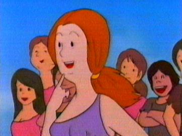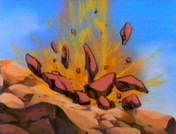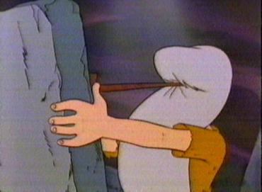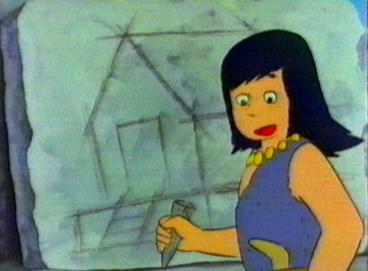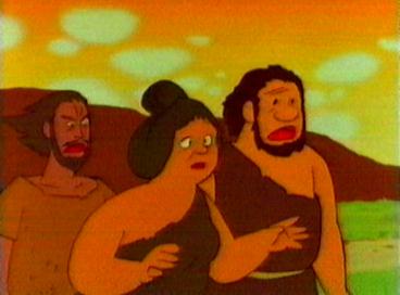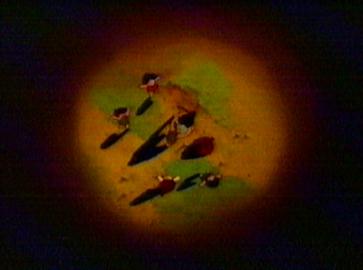 Not long after, the geyser erupts. The children run for cover and soon find them selves in hot water of another kind. The grown ups are furious that the children went up there when they had been told to stay put. Strong-arm realises that Kum Kum is the ring leader and so as a punishment he will be put into the Wood Cave. Kum Kum tries to tell them about the shadow moving and the fact that the animals are bathing. The grown ups lead by Strong-arm plug the geyser with a huge rock which holds for a few minutes but the power of the geyser destroys the rock. The children still try to explain what they have discovered. The grown ups still refuse to listen. The Wise One, however, is interested and listens to the children. Soon he realises that Kum Kum has thought of a way of measuring when the geyser will erupt - a sort of sundial. the whole village is able to make use of the hot water safe in the knowledge that the sundial will let them know when danger is approaching. The children and the villagers can then enjoy the hot water in complete safety.