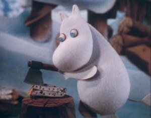 A new Winter guest had arrived searching for food. He was a thin little dog called Sorry Oo. The Hemulen came out of his igloo to exercise and then put on his skis and headed down to the Moomin house. There Moomintroll was working with the little Whomper chopping wood. The little dog followed the Hemulen hoping he would be made welcome.