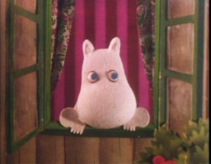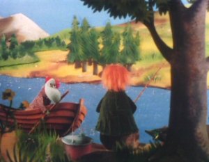 Back in the bedroom the dragon was nowhere to be seen. They looked everywhere for him and eventually found him high up on a window. The dragon wanted to go out especially when he saw Moomintroll. However the dragon took an instant liking to Snufkin and would even sit on his shoulder. The dragon preferred Snufkin to Moomintroll and would only ever fly to Snufkin, never Moomintroll. Little My eventually saw the dragon and also noticed that it preferred Snufkin. Moomintroll then let the dragon go and it flew to Snufkin who was down at the river. Moomintroll sulked in the Moomin house miserable about the loss of his pet. Down at the river Snufkin gave the dragon to a boating Hemulen and asked him to release it downstream where there were lots of flies. The Hemulen asked for some fish in return. Snufkin knew that the dragon would come between Moomintroll and himself in terms of their friendship. Snufkin let the dragon go and told Moomintroll that it must have flown off. The two friends then spent the day fishing together.