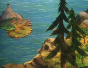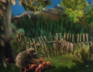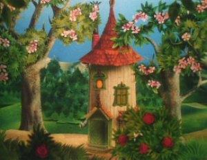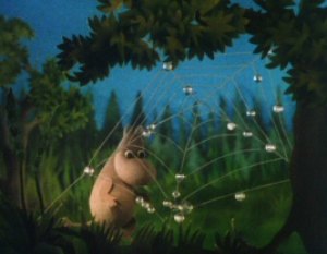 Moominpappa was still reading aloud about his memoirs. The Moomins were all listening quietly as he continued. Moominpappa awoke the next morning free from the orphanage. He walked for some time looking at the wild life and the dew drops on the spider webs. He came across and asked a small hedgehog who the land belonged to but the Hedgehog said that no one owned it. Moominpappa eventually came to a small stream and on it he saw a wondrous invention. A small water wheel like a windmill made out of leaves was spinning on a branch. It was the work of Hodgkins an inventor / constructor who soon became good friends with Moominpappa.