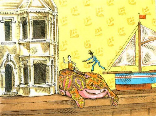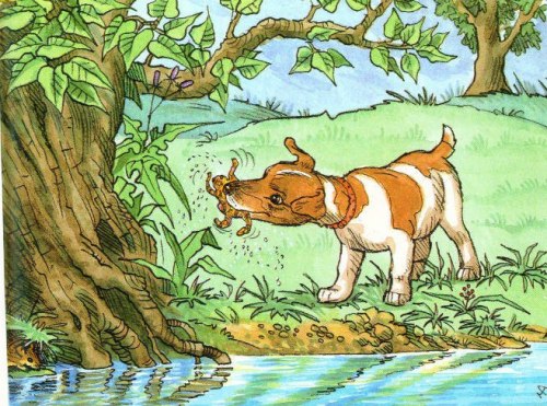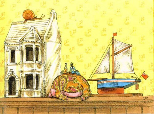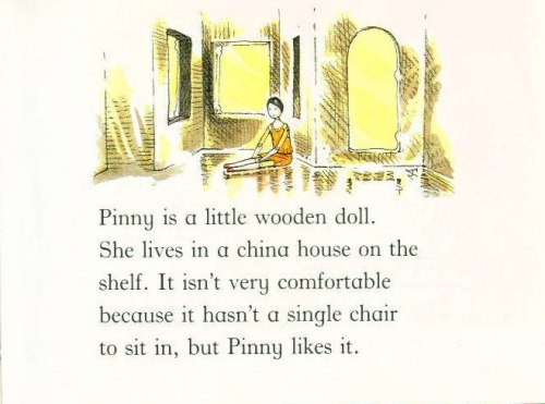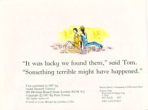 Pinny always cleans her house and Victor takes care of his little sailing boat. Tess the dog has found a cloth frog.