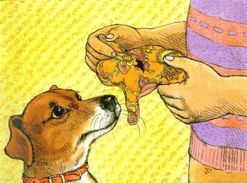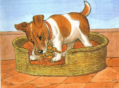 The cloth frog begins to slide off the mantelpiece along with Pinny and Victor. Tess the naughty dog springs into action and grabs the cloth toy.