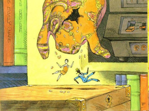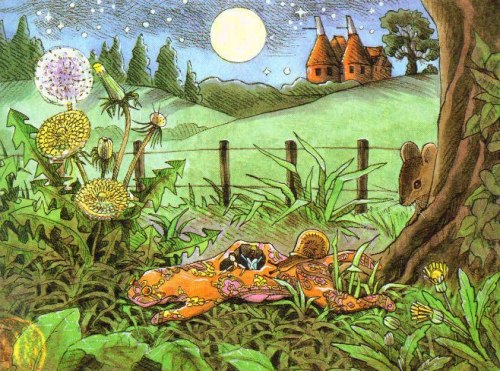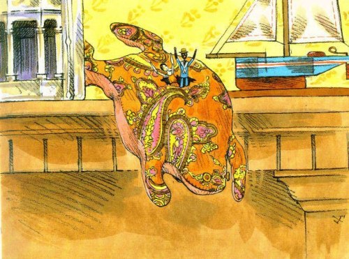 Tom shakes the frog and out falls Victor and Pinny. The frog is now mended filled with cotton wool. Pinny and Victor sat on top.
