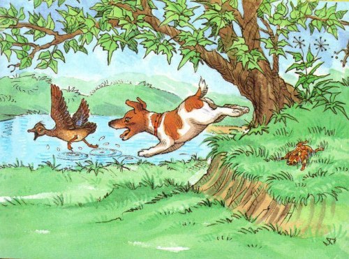Out in the garden no one can see Tess. Pinny and Victor are shaken. Tess drops the toy frog and chases a duck.