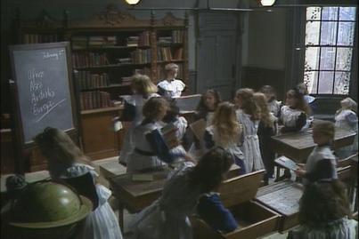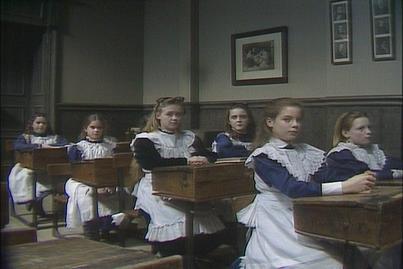 The next morning the school girls enter the classroom. They are all talking about the new school girl who has six petticoats which apparently shows she is extremely wealthy. Sara is introduced to the class by Miss Minchin who displays a little impatience with her and reveals the first hint at the possible nasty person that exists beneath the mask. She orders Sara to learn a French book as Captain Crewe has given her a French maid. Sara tries to explain that she is fluent in French but Miss Minchin refuses to listen and shouts at her to sit down and get on with the task at hand..