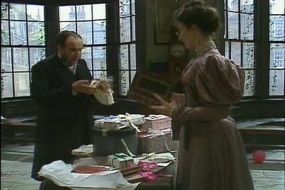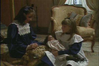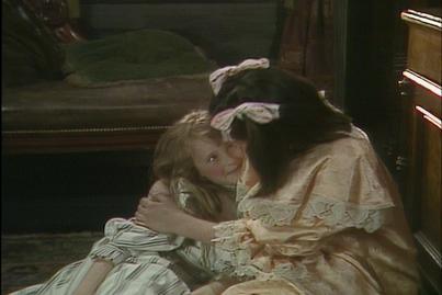 Elsewhere Miss Amelia is having trouble with Lottie who is having a tantrum on the office floor. Miss Minchin threatens to spank her if she does not stop this silly behaviour. Sara intervenes and offers to deal with Lottie. Miss Minchin and Amelia leave her to it. We soon learn that Lottie misses her mother and that like Sara her mother has died. Sara takes Lottie up to her room and shows her Emily. Becky intercepts the morning post and races upstairs with a letter for Sara. Sara gives Becky the food she purchased.