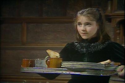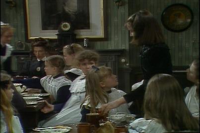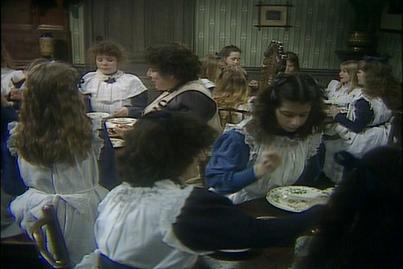 It is a cold Winter's morning. Sara cuddles up with Emily as she is awoken by Becky. Sara is dressed in an old black dress. She is late down for breakfast but she is not down to eat. Miss Minchin informs her that her duties now extend to looking after the smaller younger children and that she must ensure they do not waste food. Miss Minchin also orders Sara to call her mum since she will be looking after her. Some of the nastier girls smile at each other happy that Sara is suffering.