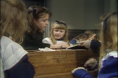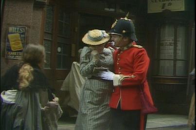Back in England, Sara is helping Lottie and the younger children with their studies. Later running errands for cook, Sara sees a soldier in uniform that reminds her of her late father. She looks at all the fruit and food but knows she cannot have any of it.
