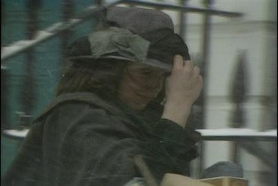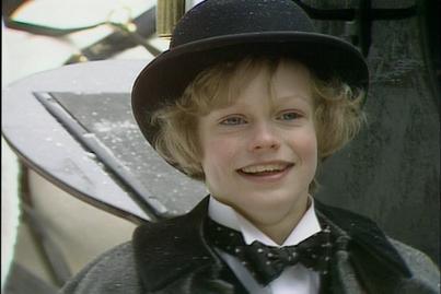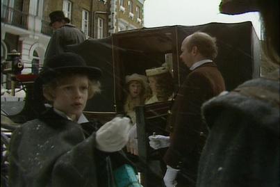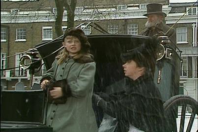 The next day, it has been snowing. Sara again is out running errands. She stops outside to watch two small children getting into a carriage. The small boy stops, smiles and gives Sara a sixpence as he is concerned that she will not have much to eat this Christmas. Sara says thankyou and watches the carriage head off. In her room, that night, Sara tells Emily that she will not spend it but instead have to turned into a necklace and place it around her neck.