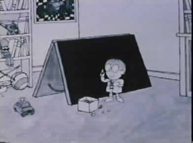 Simon gets up early in the morning and is walking along the street. Here he meets the school teacher from the land of chalk drawings (LOCW). The school teacher tells Simon that there is a problem in LOCW. This concerns his pupils all of whom are all asleep and will not get up in the morning. So Simon agrees to come and help. Simon climbs up the ladder and over the fence and into LOCW. There he finds all the chalk people, chalk animals and even the chalk Sun fast asleep. He instantly has an idea on how to wake everyone up and goes home to his special blackboard (where whatever he draws comes to life). The next morning a chalk drawing cockrel wakes everyone up on time for school. However this is short lived as the very next day the cockrel has lost its voice so everyone is asleep again. Simon finally solves the problem by drawing a huge alarm clock to ring at exactly 07:30 which it does and so everyone is able to get up on time.