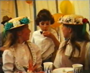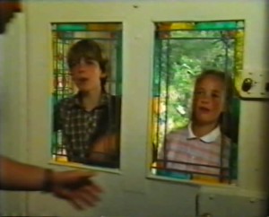 As Mrs. Ems is talking to the children, the wax dummy falls over and the wig